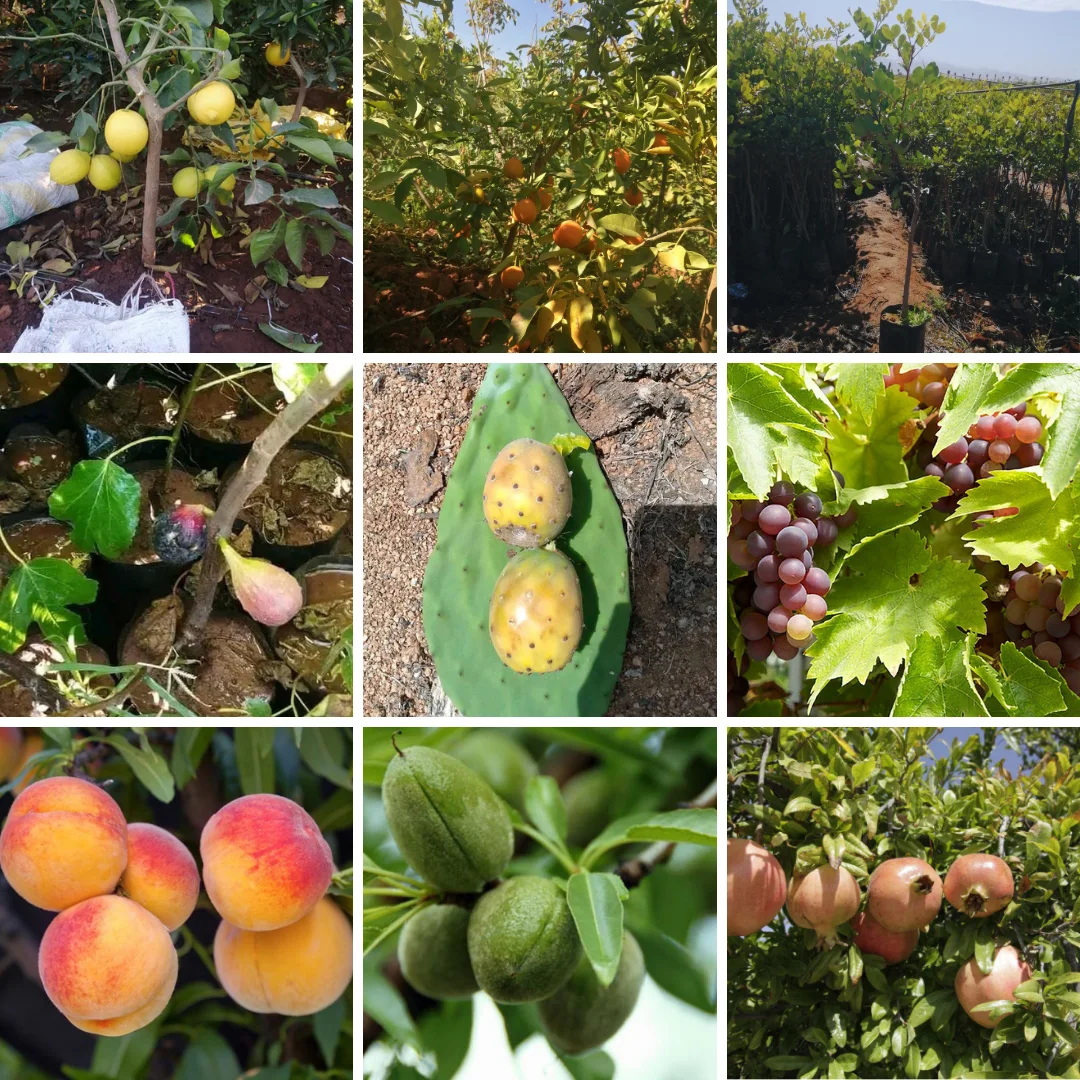 اللوز،العنب، الرمان، الهندية،الخروب، الليمون، الحامض، الخوخ ،المشماش، التفاح، البرقوق، الافوكا.....